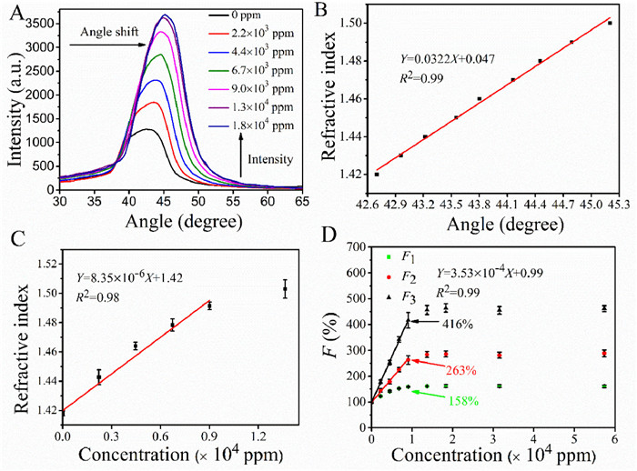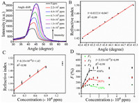 | Fig. 4. (A) The angle distribution pattern of the RhB@ZIF-8-SPCE sensor recorded at 579 nm light when exposed to different concentration of isopropanol vapor. (B) Refractive index of RhB@ZIF-8 film as a function of SPCE angle. (C) Dependence of the refractive index of RhB@ZIF-8 film on concentration of isopropanol vapor. (D) The fluorescence intensity variations of the RhB@ZIF-8-SPCE sensor exposed to different concentration of isopropanol vapor. | |