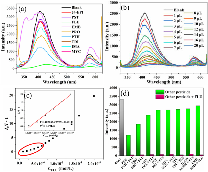 We conducted a luminescence sensing experiment for pesticides like emamectin benzoate (EMB), triadimefon (TRI), prochloraz (PRO), Pyrimethanil (PTH), 24-epibrassinolide (24-EPI), pyraclostr-onbin (PST), fluazinam (FLU), Zhongsheng-mycin (MYC), and imazalil (IMA). As shown in Fig. 1a, the luminescence of RhB@1 was completely quenched in FLU, while the quenching effect of other pesticides was not good, which could indicate that the detection performance of RhB@1 for FLU was better than that of other pesticides. Concentration titration experiment was subsequently performed to discuss the responsiveness of RhB@1 to FLU. When the concentration of FLU increased gradually, the fluorescence intensity gradually decreased, and when added to 20 µL, the fluorescence of RhB@1 was almost completely quenched (Fig. 1b). In addition, the Stern-Volmer (SV) equation (I0/I = 1 + Ksv[M]) can be used to further study the relationship between FLU concentration and fluorescence intensity. In particular, a good liner relationship was observed at low concentration of FLU (R2 = 0.99147), the Ksv value is 4.02 × 105 L/mol, but at high concentrations, deviations from linearity could be explained by self-absorption or energy transfer (Fig. 1c). Based on the slope of the fitting line and the standard deviation of the blank sample, the detection limit was calculated to be 7.94 nmol/L (at the 3σ level).