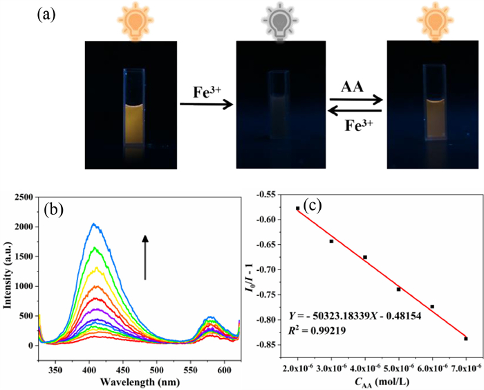 | Fig. 3. (a) Corresponding photos of RhB@1 at Fe3+ and AA under 365 nm UV light. (b) Fluorescence emission spectra of RhB@1/Fe3+-system for different concentrations of AA. (c) Linear plot of AA concentration versus fluorescence intensity. | |