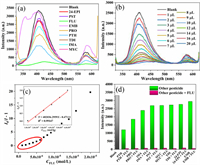 | Fig. 1. (a) Fluorescence spectra of RhB@1 with various pesticides. (b) Fluorescence spectrum of RhB@1 in water with different concentrations of FLU. (c) Fluorescence Stern-Volmer equation and the linear relationship of I0/I - 1 with FLU concentration. (d) Comparison of the luminescence intensity of RhB@1 in presence of others pesticides. | |