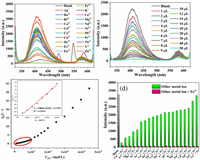 | Fig. 2. (a) Fluorescence spectra of RhB@1 with various metal ions. (b) Fluorescence spectrum of RhB@1 in water with different concentrations of Fe3+. (c) Fluorescence Stern-Volmer equation and the linear relationship of I0/I - 1 with Fe3+ concentration. (d) Comparison of the luminescence intensity of RhB@1 in presence of others metal ions. | |
