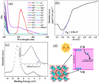| Fig. 4. (a) The excitation spectra of RhB@1 and UV-vis absorption of Fe3+ and other metal ions in aqueous solution. (b) Corresponding Tauc plots of the RhB@1, and the dotted line is the linear fitting. (c) VB-XPS spectra of RhB@1. (d) Principle scheme of PET mechanism between Fe3+ and RhB@1 composites. | |
