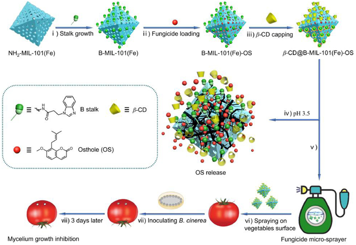 | Fig. 1. Schematic description of the fabrication of the supramolecular fungicide delivery system, using B-MIL-101(Fe) as nanocarriers loaded with OS, and β-CD as nanovalves to form β-CD@B-MIL-101(Fe)-OS for B. cinerea control. | |