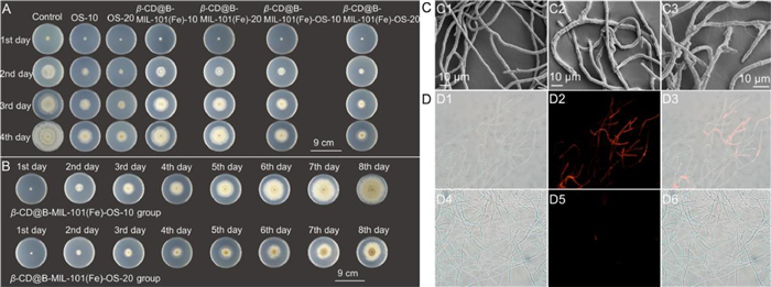 | Fig. 3. (A) In vitro antifungal activity of OS, β-CD@B-MIL-101(Fe), and β-CD@B-MIL-101(Fe)-OS against B. cinerea at the corresponding concentrations and control group from the 1st day to the 4th day. (B) Antifungal activity of β-CD@B-MIL-101(Fe)-OS against B. cinerea at the corresponding concentrations from the 1st day to the 8th day. (C) SEM images of the mycelia incubated in CM for 84 h (C1), treated with β-CD@B-MIL-101(Fe)-OS (20 µg/mL) for 6 h (C2), and (C3) for 12 h. (D) Fluorescence images (10 × 20 times scope) of mycelia treated with β-CD@B-MIL-101(Fe)-OS (20 µg/mL) for 12 h and stained with the PI solution under (D1) bright field, (D2) dark field, and (D3) the merged image of (D1) and (D2). Fluorescence images of mycelium in the control group stained with PI solution under (D4) bright field, (D5) dark field, and (D6) the merged image of (D4) and (D5). | |