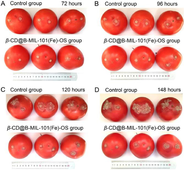 | Fig. 4. Protective effect of β-CD@B-MIL-101(Fe)-OS on tomato. Images of tomatoes treated with β-CD@B-MIL-101(Fe)-OS at 100 µg/mL and control group inoculated with the fungus cake (5 mm in diameter) of B. cinerea for (A) 72, (B) 96, (C) 120, and (D) 148 h. | |