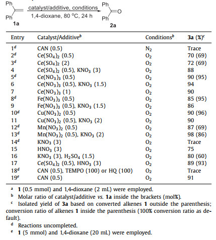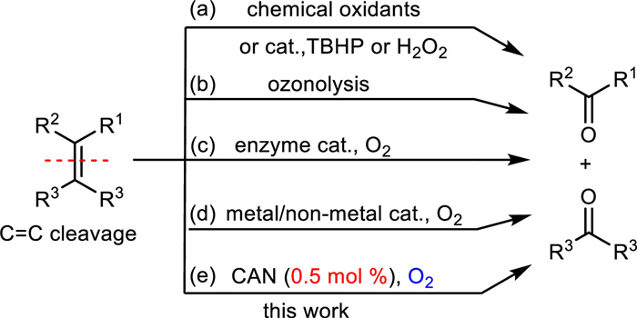 In conclusion, we have developed a novel method to split the C=C bond in alkenes by using molecular oxygen as the cheap and clean oxidant. The reaction was catalyzed by low-loading CAN (0.5 mol%) free of any additives. Mechanism studies demonstrated that the ultrahigh catalytic activity of CAN attributed to the fact that both Ce and nitrate may participate the reaction as catalyst via the coupled Ce(Ⅳ)-Ce(Ⅲ) circle and nitroxide circle respectively. The catalyitic activity of anions such as NO3− is a novel finding. It is surprising that the catalytic activity of NO3− is so strong that it can even catalyze the oxidative alkene cracking reaction, which consumes a lot of reaction energy for the high C=C bond dissociation energy (ca. 609 kJ/mol). This work not only provides an efficient method for carbonyl synthesis, but also leads to a new pathway for biomass degradation, as well as the recycling of the C=C bond-containing waste polymer. It might also inspire new ideas for catalytic system design: the significances of anions in the system should be noticed. Further investigations on the design and application of Ce catalysts are ongoing in our laboratory.