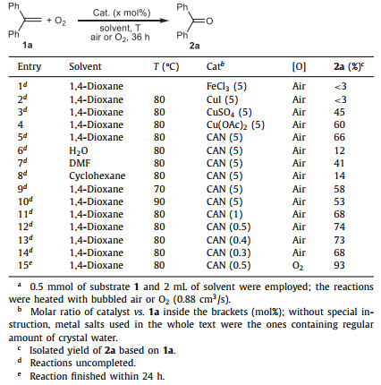 1,1-Diphenyl ethene (1a) was chosen as the model substrate and FeCl3 was initially used as the metal catalyst. However, almost no reaction occurred when heating 1a and FeCl3 in 1,4-dioxane with air (Table 1, entry 1). CuI was also ineffective for the reaction (Table 1, entry 2), but by using CuSO4 or Cu(OAc)2 as catalyst, the desired reaction occurred to produce ketone 2a in 45%–60% yields (Table 1, entries 3 and 4). CAN was then found to be an even better catalyst, affording 2a in enhanced yield (Table 1, entry 5). Besides 1,4-dioxane, other solvents, such as water, DMF and cyclohexane were tested, but all of them led to decreased 2a yield (Table 1, entries 6–8). Reducing or enhancing the reaction temperature both led to decreased product yields (Table 1, entries 9, 10 vs. 5). Using less catalyst did not reduce the product yield and with 0.5 mol% of CAN, the reaction could produce 2a in the highest yield (Table 1, entries 12 vs. 5, 11, 13, 14). In the above reactions, substrate 1a was not completely converted and could be observed in thin layer chromatography. Thus, pure O2 was then employed as a stronger oxidant instead of air. We were very glad to find that, the reaction was accelerated and could complete within 24 h to produce 2a in 93% yield (Table 1, entry 15).