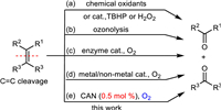 In our cases, we have investigated the oxidative cracking reaction of alkenes by using selenium catalysts, but it requires the use of H2O2 oxidant or relatively harsh reaction conditions, or suffer from the incompletely converted substrates [24]. Cerium(Ⅳ) ammonium nitrate (CAN)-catalyzed aerobic oxidation of alkenes was also reported, but the substrates were majorly styrenes or methylenecyclobutanes, and the use of 5–200 mol% of CAN was required in those works [25,26]. Recently, we unexpectedly found that, the nitrate anion (NO3−) in CAN was also a strong catalyst and it could even catalyze the oxidative C=C cracking reaction, so that the CAN catalyst loading could be reduced to be as low as 0.5 mol% (Scheme 1, method e). Herein, we wish to report our findings.