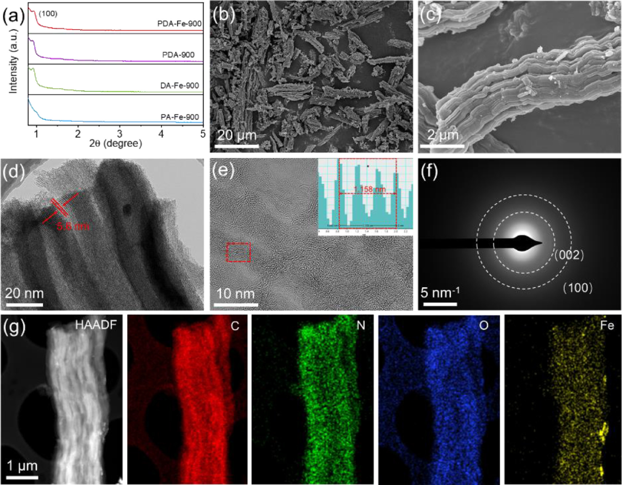 | Fig. 1. Structural characterization: (a) Small-angle XRD patterns of PDA-900, PDA-Fe-900, PA-Fe-900 and DA-Fe-900. (b, c) SEM images, (d) TEM image, (e) HR-TEM image, (f) SAED pattern, (g) HAADF-STEM image and the corresponding EDS element mappings of PDA-Fe-900. | |
