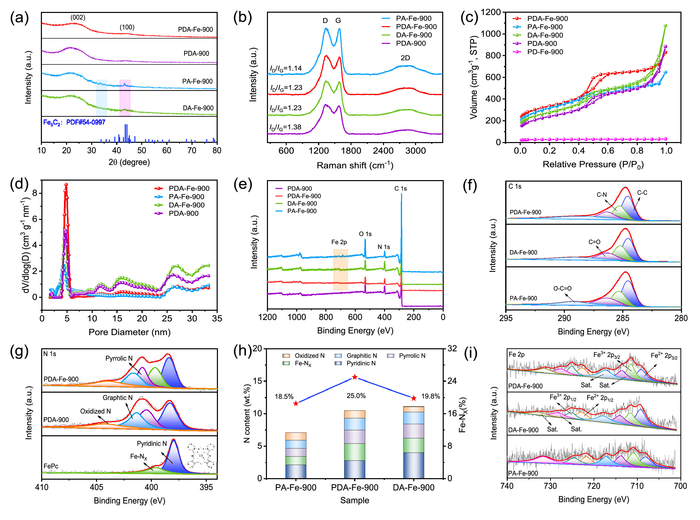 | Fig. 2. (a) Wide-angle XRD patterns and (b) Raman spectra of PDA-Fe-900, PA-Fe-900, DA-Fe-900 and PDA-900. (c) N2 adsorption-desorption isotherms and (d) pore size distribution of PDA-Fe-900, PA-Fe-900, DA-Fe-900, PDA-900 and PD-Fe-900. (e) XPS full spectrum and (f) C 1s of PDA-Fe-900, PA-Fe-900, DA-Fe-900 and PDA-900. (g) N 1s XPS spectra of PDA-Fe-900, FePc and PDA-900. (h) Content of the total N and different N species, the percentage of Fe-NX and (i) Fe 2p for PDA-Fe-900, PA-Fe-900 and DA-Fe-900. | |