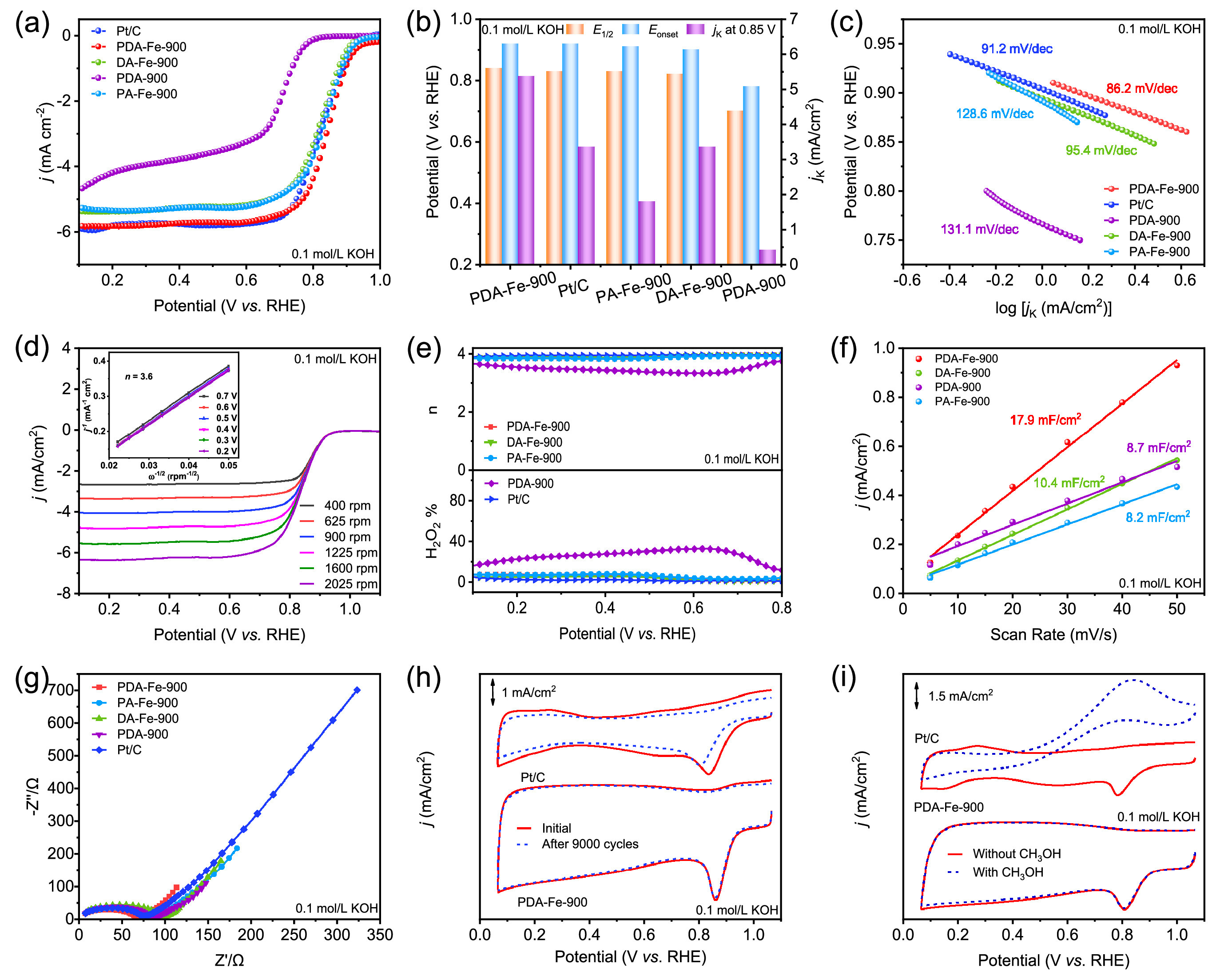 | Fig. 3. ORR performance in 0.1 mol/L KOH: (a) LSV curves, (b) jK, E1/2 and Eonset and (c) Tafel plots of the PDA-Fe-900, PA-Fe-900, DA-Fe-900, PDA-900 and commercial Pt/C. (d) LSV curves of PDA-Fe-900 at different rotation speeds (inset shows K-L plots at different potentials). (e) n and H2O2%. (f) Cdl. (g) EIS for the PDA-Fe-900, PA-Fe-900, DA-Fe-900, PDA-900 and commercial Pt/C. (h) CV curves before and after 9000 potential cycles, (i) CV curves before and after addition of CH3OH solution for PDA-Fe-900 and commercial Pt/C. | |