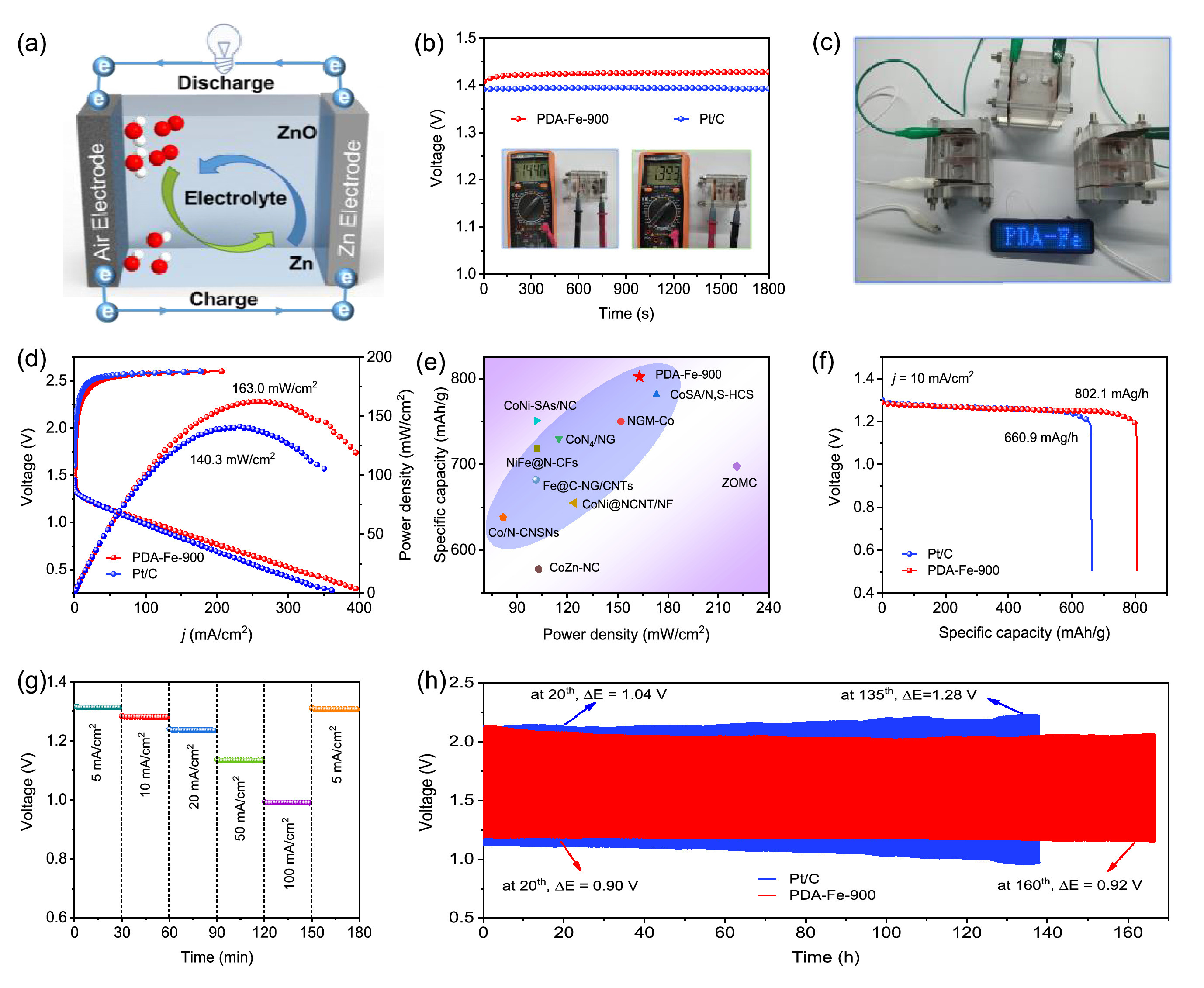 Additionally, Fig. 5f shows the galvanostatic discharge curves of PDA-Fe-900 and Pt/C driven ZABs at a constant current density of 10 mA/cm2. By normalizing with respect to the mass of consumed Zn, the specific capacity of PDA-Fe-900 based ZAB is calculated to be 802.1 mAh/g, superior to that of Pt/C based ZAB (660.9 mAh/g) as well as ZABs based on recently reported catalysts (Fig. 5e and Table S5 in Supporting information) [55]. The galvanostatic discharge curves of PDA-Fe-900 driven ZAB at different current densities from 5 to 100 mA/cm2 exhibit the stable potential plateaus, which confirms the excellent rate performance of PDA-Fe-900 driven ZAB (Fig. 5g). In addition, the long-term cycle stability of liquid rechargeable ZAB with PDA-Fe-900 is further evaluated by continuous galvanostatic discharge-charge test at 5 mA/cm2 with 10 min per cycle (Fig. 5h). Obviously, the PDA-Fe-900 based ZAB can stably operate for a longer time than Pt/C based ZAB. Specifically, the PDA-Fe-900 based ZAB delivers an excellent stability over 160 h, and the charge-discharge voltage range shows only a slight increase from 0.90 V in 20th h to 0.92 V at 160th h. On the contrary, the Pt/C based ZAB exhibits the poor cycle life of 135 h, and the charge-discharge voltage range changes significantly from the 1.04 V in 20th h to 1.28 V at 135th h. These results reveal that the PDA-Fe-900 based ZAB displays an unprecedented rechargeable ability and long-term stability. As well known, the ZABs performance is mainly related to the porous structure of the cathode catalysts. Therefore, this unique ordered mesoporous structure accompanying with abundant accessible Fe-NX active sites endows PDA-Fe-900 catalyst a promising Pt/C catalyst alternative to achieve the long-term stability of ZABs.