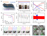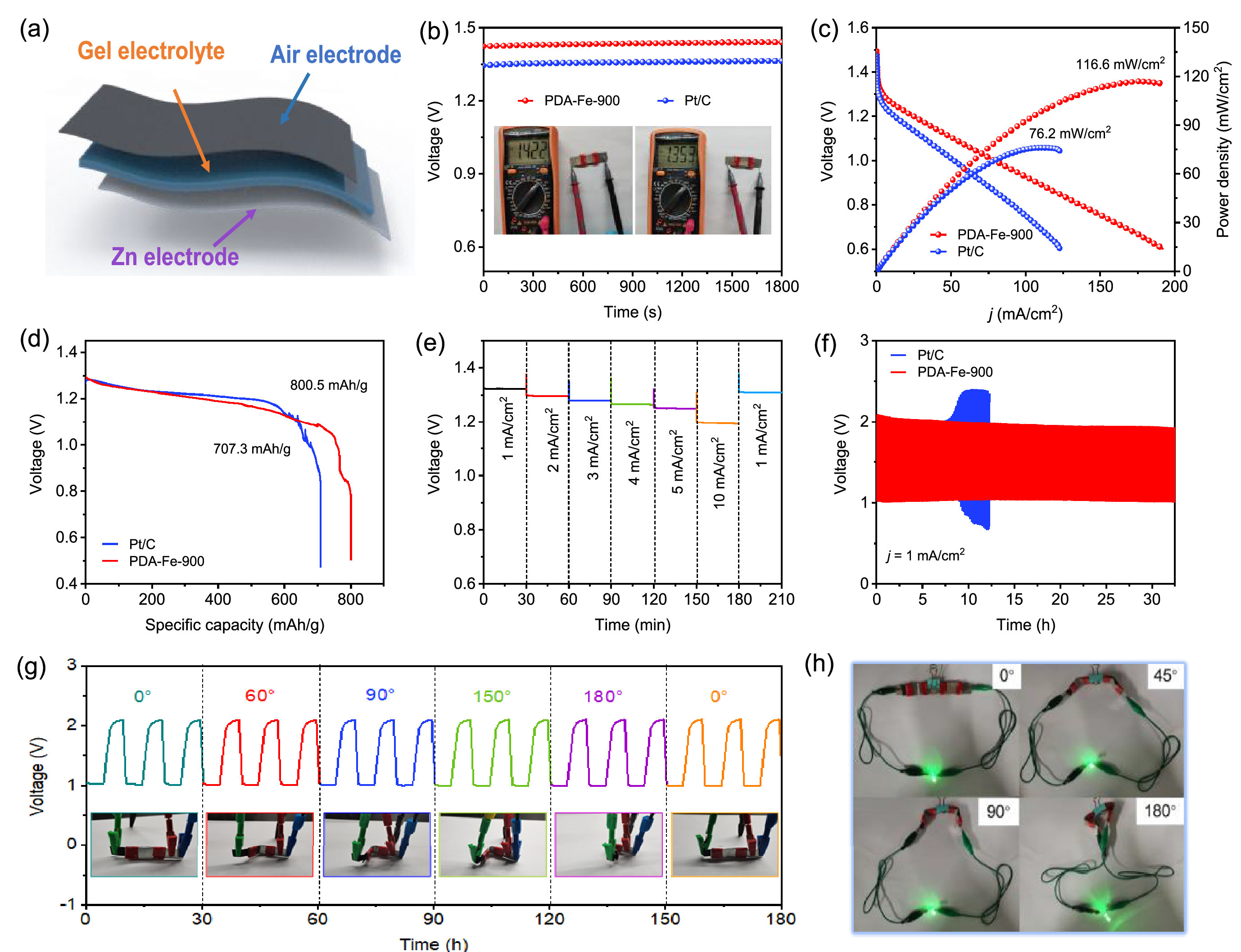 | Fig. 6. Flexibility rechargeable ZAB: (a) Schematic illustration of flexibility rechargeable ZAB. (b) OCV of ZABs based on PDA-Fe-900 and Pt/C. (c) Discharge polarization curves and corresponding power densities of ZABs based on PDA-Fe-900 and Pt/C. (d) Discharge curves at a current density of 5 mA/cm2. (e) Discharge curves of the PDA-Fe-900-based ZABs at various current densities. (f) Galvanostatic charge/discharge cycling performance of ZAB based on PDA-Fe-900 and Pt/C at a current density of 1 mA/cm2. (g) Cycling stability of the ZAB under different bending angles. (h) Photographs of a LED light powered by two flexible ZAB based on PDA-Fe-900 under different bending deformations. | |