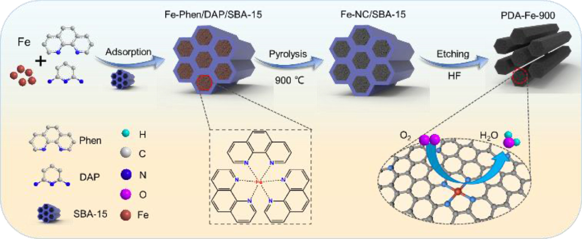 2,6-Diaminopyridine (DAP, C5H7N3), 1,10-phenanthroline (Phen, C12H8N2), ferrous sulfate (FeSO4·7H2O), potassium hydroxide (KOH) and zinc acetate (Zn(OAc)2) were obtained from Shanghai Aladdin Biochemical Technology Co., Ltd. SBA-15 was purchased from Jiangsu XFNANO material technology Co., Ltd. and zinc plate was from Qinghe Tengfeng metal material Co., Ltd. Hydrofluoric acid (HF) and sulphuric acid (H2SO4) were supplied from Shandong Yantai Shuangshuang Chemical Co., Ltd. Nafion (5 wt%), commercial Pt/C (20 wt%) and carbon fiber paper were supplied from Shanghai Hesen Electric Co., Ltd. Electrode composite matrix was purchased from Changsha Spring Co., Ltd. All chemical reagents were employed directly without further purification.
