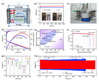 | Fig. 5. Liquid rechargeable ZAB: (a) Schematic configuration of liquid rechargeable ZAB. (b) OCV of ZABs based on PDA-Fe-900 and Pt/C. (c) Power supply of LED screen by three series-connected PDA-Fe-900 based ZABs. (d) Polarization and power density curves of the ZAB using PDA-Fe-900 and Pt/C. (e) Comparison of the power density and specific capacity for PDA-Fe-900 and the recently reported catalysts in supplementary Table S5 in Supporting information. (f) Discharge curves at a current density of 10 mA/cm2. (g) Discharge curves of the PDA-Fe-900 based ZABs at various current densities (5-100 mA/cm2). (h) Stability at a content current density of 5 mA/cm2. | |