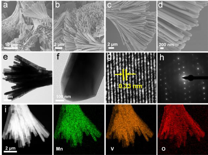 | Fig. 1. The MVO-16 sample structural characterization of the as-obtained nanorods: (a-d) SEM images of different magnification; (e, f) TEM images under different magnification; (g) HRTEM image; (h) SAED pattern; (i) EDS elemental mapping images. | |