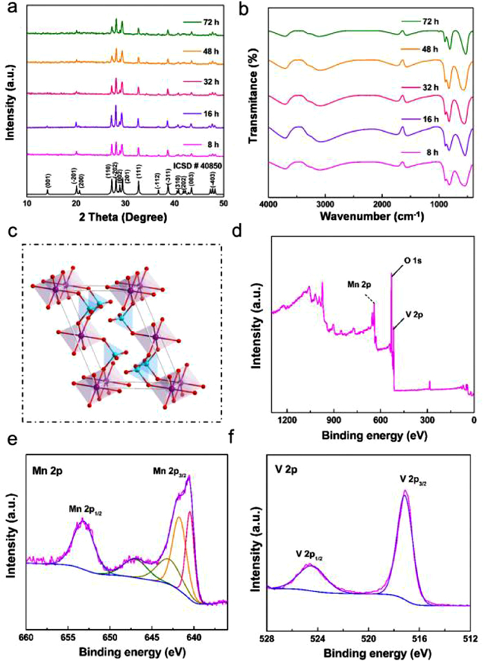 | Fig. 2. (a) XRD pattern of MVO-16 sample. (b) FTIR spectrum of the as-prepared MnV2O6 samples for 8–72 h. (c) The schematic crystalline structure of the MnV2O6 unit cell from different axes. XPS spectra of the MVO-16: (d) Survey scan, (e) Mn2p and (f) V2p. | |