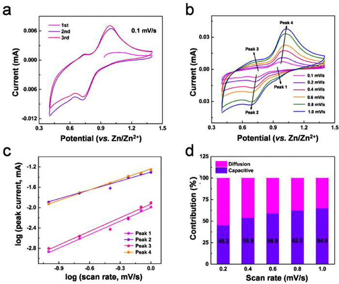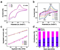 | Fig. 3. Cyclic voltammetry of the MVO-16 cathode in aqueous Zn(CF3SO3)2 electrolyte: (a) Initial three cycles of CV curves at 0.1 mV/s; (b) Typical CV curve at different scan rates of 0.1–1 mV/s; (c) log(i) versus log(v) plots at the cathodic current response at four peaks; (d) Separation of the capacitive and diffusion-controlled charge contributions ratios at different scan rates. | |