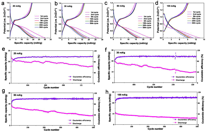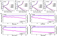| Fig. 4. (a-d) Galvanostatic charge/discharge profile of MVO-16 for different cycles at different discharge current densities of 20, 30, 50 and 100 mA/g; (e-h) Cycling performance at different discharge current densities of 20, 30, 50 and 100 mA/g. | |