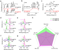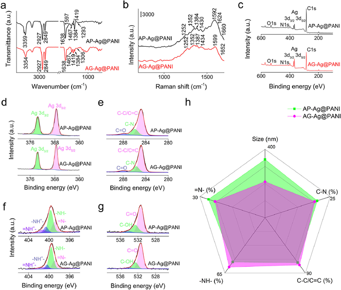 | Fig. 2. (a) FTIR spectra, (b) Raman spectra, (c) XPS survey spectra, (d) high-resolution Ag 3d XPS spectra, (e) C 1s XPS spectra, (f) N 1s XPS spectra, (g) O 1s XPS spectra and (h) the comparison of different groups percentage and size of AP-Ag@PANI and AG-Ag@PANI, respectively. | |