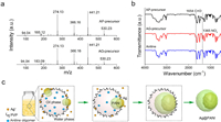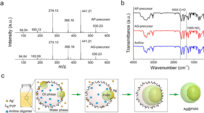 | Fig. 3. (a) TOF-MS of AP-precursor and AG-precursor, (b) FTIR spectra of AP-precursor, AG-precursor and pure aniline, and (c) schematic diagram of the proposed formation process of eccentric Ag@PANI structure in an oil/water biphasic system. | |