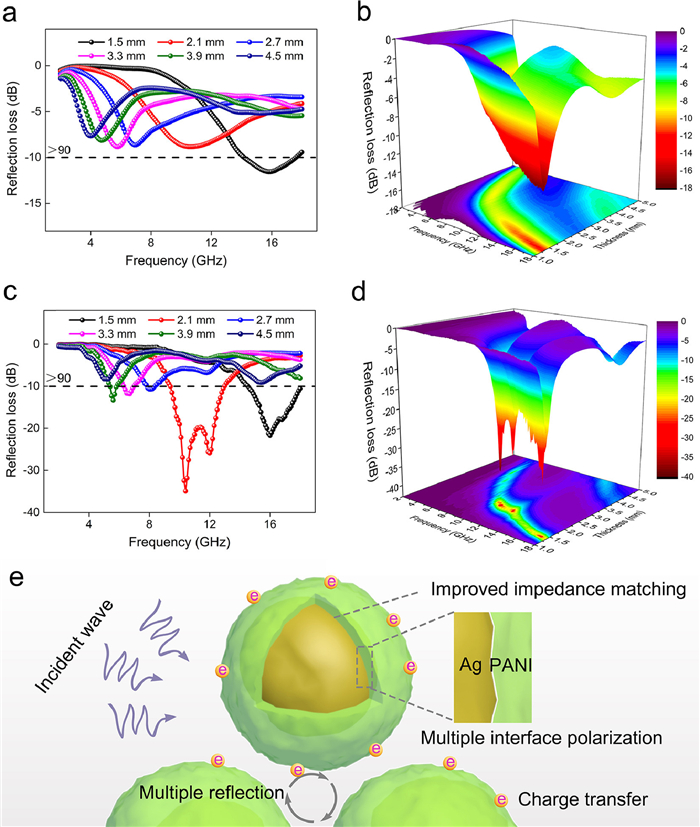 | Fig. 4. (a, c) Reflection loss curves and (b, d) three-dimensional reflection loss representations of the pure PANI and AP-Ag@PANI. (e) Schematic illustration of the absorption mechanism of eccentric Ag@PANI composites. | |