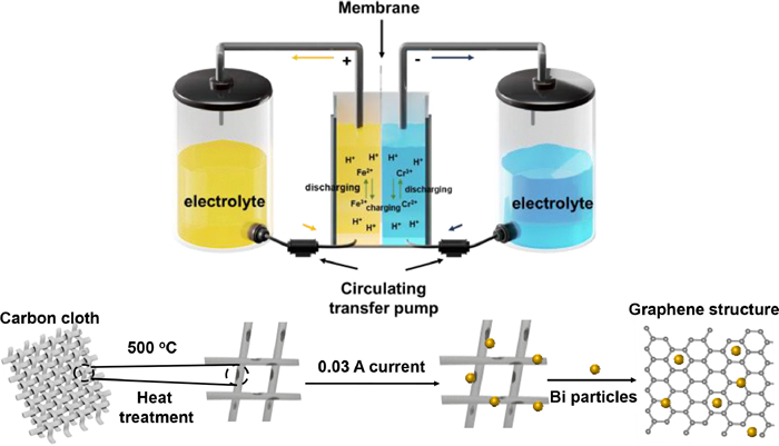 Meanwhile, bismuth (Bi) catalyst has attracted more attention in RFBs due to its low cost and high catalytic activity in recent years [31]. David J. Suárez et al. reported that graphite felt decorated with Bi nanoparticles can alleviate H2 hydrogen precipitation and improve the reaction rate of V3+/V2+ in all-vanadium redox flow batteries (VRBs) [32]. Bin Li et al. also modified Bi nanoparticles on the negative electrode by electrochemical deposition and demonstrated that Bi nanoparticles facilitate the EE of VRBs at high current densities [33]. In previous studies, carbon felt (CF) [31] or graphite felt (GF) [34] were always used as electrodes of ICRFBs, and carbon cloth (CC) was rarely studied. CC has well-distributed pores and ordered carbon fibers [35,36]. In comparison to CF and GF, it has a lower ohmic resistance and performs ion/mass transport with greater efficiency [37]. By facilitating the diffusion of electrolyte within the electrode and reducing the ohmic polarization of the battery while it is operating, CC can be used as an electrode material to enhance the electrochemical reaction on the electrode [35,38]. Besides, although Bi particles was used as a catalyst in RFBs, the mechanism of bismuth particle enhanced electrochemical activity of electrode hasn't been fully explained.