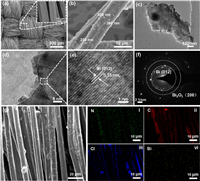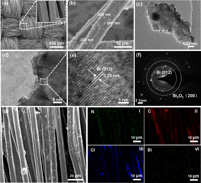 The morphologies of composited carbon cloth samples are shown in Fig. 2. The electrode made by TCC demonstrated a three-dimensional structure, which has ordered carbon fibers and large pores. There were some shaped grooves and defects on the carbon fibers (Fig. 2a). Fig. 2b shows Bi/TCC prepared through electrochemical deposition. On the surface of the carbon fibers, several particles could be seen, and the size of these particles varied from 200 nm to 400 nm. Simultaneously, TEM was used to observe particles on the electrode surface (Fig. 2c). HRTEM images demonstrated that Bi particles on the decorated electrode have good crystallinity. As shown in Figs. 2d and e, the relative lattice spacing was measured to be 0.33 nm, and corresponds to the (012) crystal plane of Bi particles (Fig. 2f) [42]. In addition, the (200) crystal plane of Bi2O3 was identified in Fig. 2f, which suggests that Bi particles were partially oxidized. To further confirm the substance deposited on the electrode, EDS mapping was used, and these particles were identified as Bi (Fig. S1 in Supporting information). Fig. 2g shows Bi was evenly dispersed on the surface of the TCC electrode, indicating that the catalyst was well deposited. The existing defects and the introduction of the Bi catalyst heighten the wettability and specific surface area of the original electrode [37,43], reducing the contact angle of Bi/TCC in comparison to TCC (Fig. S2 in Supporting information).