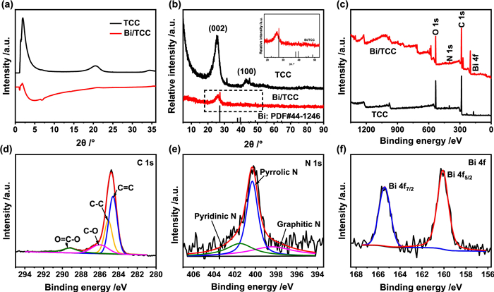 | Fig. 3. (a) Synchrotron radiation diffraction images of the TCC and Bi/TCC samples. (b) XRD image of the TCC and Bi/TCC. (c) XPS survey spectra of the samples. (d) C 1s, (e) N 1s and (f) Bi 4f XPS spectra of the Bi/TCC. | |
