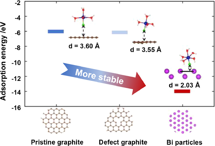 The calculation is introduced to explain the improvement in performance by density function theory (DFT). From Fig. 5, the absorption energy of pristine graphite (0001) was −6.00 eV. There are more stable configurations, when Cr(Ⅲ) was adsorbed on the defect graphite and Bi particles (001) surfaces with respective adsorption energies of −6.12 eV and −14.00 eV. Both of them were less than the pristine graphite (0001). The energy of adsorbing Cr(Ⅲ) on the Bi particles surface is 2.33 times higher than on the graphite surface, suggesting that the adsorption configuration of Bi particles was more stable. Besides, the interplay distance between Cr(Ⅲ) and Bi particles (2.03 Å) was shorter than that of graphite (3.60 Å), promoting the transport of electrons. The Gibbs free energy was calculated to find out the spontaneity of the adsorption process on the graphite and Bi particles surfaces. The result showed that both of them were less than zero, showing the adsorption process was spontaneous. Furthermore, the Gibbs free energy (ΔG) of Bi particles (−15.50 eV) was lower than that of graphite (−6.34 eV) and defect graphite (−6.38 eV) (Table S2 in Supporting information), which demonstrates the Bi particles surface adsorption of Cr(Ⅲ) was more easily performed.