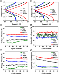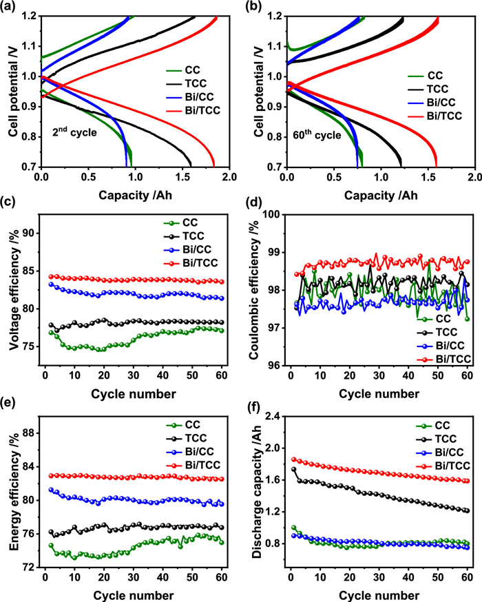 | Fig. 7. Cell voltage profiles of CC, TCC, Bi/CC and Bi/TCC assembled cells in the (a) 2nd and (b) 60th cycle. (c) voltage efficiency, (d) Coulombic efficiency, (e) energy efficiency and (f) discharge capacity of different electrodes assembled cells in 60 cycles at a constant current density of 140 mA/cm2. | |