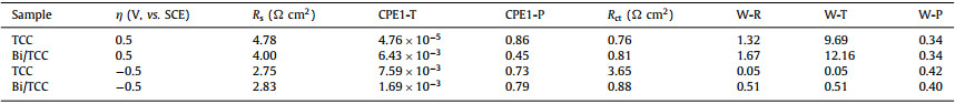 Figs. 4c and d compare EIS spectra of different samples at polarization voltages (η) of 0.5 V and −0.5 V (vs. SCE). Each EIS spectrum was combined with a semicircle and a line, which stand for the high frequency and low frequency ranges, respectively [48]. The spectra proved that the redox reactions of Fe2+/Fe3+ and Cr3+/Cr2+couples happened on the sample surface and are primarily governed by a combination of both diffusion and charge transfer [49,50]. Each Nyquist plot was fitted into an equivalent circuit (Fig. S5 in Supporting information). Rs performs the ohmic resistance of the solution and electrode, the charge transfer resistance of an electrochemical reaction is represented by Rct, and CPE stands for the double-layer capacitance of the interface between electrolyte and electrode, which consists both of CPE-T and CPE-P. W stands for diffusion resistance, and defined parameters as W-R, W-T and W-P. Table 1 displays the relative electrochemical fitted data obtained from Zview. When η was 0.5 V, the values of Rs decreased as introducing Bi catalyst, which showed a high conductivity. As the Rct value of increased with Bi catalyst deposition, it was possibly explained that Fe2+/Fe3+ redox couple had a low electrochemical activity. At η is −0.5 V, Bi/TCC had a lower R value in contrast to TCC, and the value of Rct reduced remarkably, which indicated Bi catalyst had a significant activation effect on the Cr3+/Cr2+ redox couple. These results confirmed the electrochemical properties toward the Cr3+/Cr2+ redox reaction was prominently enhanced by the introduction of Bi catalyst, which agreed with the results of the CV test.