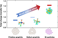 The charge density difference for Cr(Ⅲ) absorbed on the graphite and Bi particles surfaces are displayed in Fig. 6. The charge transfer between graphite and the hydrate of Cr mainly occurred on the graphite surface. On the contrary, there existed more charge transfer from Bi particles to the hydrate of Cr(Ⅲ) especially around the adsorbed water molecules and the Bi particles surface, resulting in strong adsorption. The Bader charge was also analyzed to explain the strong electron transfer. The value of the Bader charge on the Bi particles surface was higher than that of the graphite, and the total charge transfer was 1.21 |e|. Meanwhile, the total charge transfer for graphite and defect graphite were 0.94 and 0.99 |e|, respectively. Detailed simulation information can be found in Figs. S6 and S7 (Supporting information). The result was consistent with the charge density difference, demonstrating that the Bi catalyst transfers more electrons and had high activity compared with pristine graphite, which could provide more active sites in the reaction. The defect graphite was more suitable for the reaction of Cr(Ⅲ) than the intact graphite in every aspect.