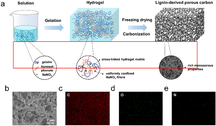 | Fig. 1. (a) Schematic illustration for the synthesis of advanced lignin-derived porous carbons. (b) SEM image and corresponding EDS mappings of (c) C, (d) O and (e) N elements for LPC-0.5 sample. | |