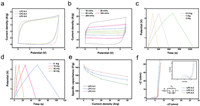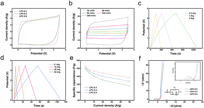 | Fig. 3. The electrochemical properties of LPC-X (X = 0.3, 0.4 and 0.5) materials in EMIBF4 ILs. (a) CV curves of LPC-Xs measured at 50 mV/s. (b) CV curves of LPC-0.5 under different scan rates ranged from 10 mV/s to 200 mV/s. (c, d) GCD curves of LPC-0.5 tested from 0.5 A/g to 50 A/g. (e) The rate capabilities. (f) EIS spectra. The inset exhibited the equivalent circuit model of EIS. | |