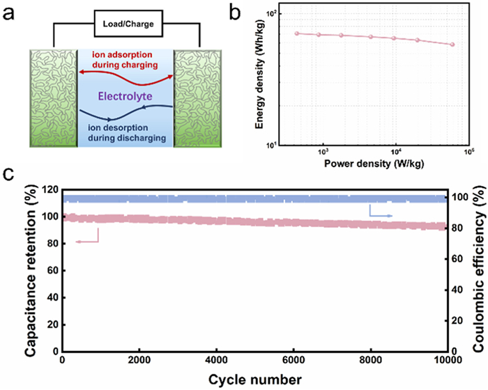 The ever-flourishing electric vehicles, portable electronic devices and stationary energy storage systems have attracted worldwide attention towards high energy– power density electrochemical storage devices [1–5]. Supercapacitors hold the advantages of high-power output capability, fast charge-discharge rate, and long-time cycling stability, showing tremendous potential in high-power designs [6–9]. Unfortunately, their practical applications have long been constrained by the relatively poor energy density (5–20 Wh/kg) [10–12]. Theoretically, the energy density (E) of supercapacitors is determined by the operation voltage (V) and capacitance (C) according to the equation, E = 0.5CV2 [13,14]. That is, a high E can be obtained by increasing C or enlarging V. In this regard, ionic liquid (IL) electrolyte with wide voltage window (3.7–5 V) exhibits a prominent superiority compared to its aqueous electrolyte counterparts (about 1 V) [15–17]. Besides, the peculiarities of low volatility and non-flammability also render IL effectively avoid the safety hazards caused by leakage and flame of conventional organic electrolyte [18–20]. Nevertheless, their intrinsic high viscosity and large ionic size always lead to poor affinity to most carbon electrode materials with insufficient micropores structure (< 2 nm), thus resulting in sluggish ion diffusion kinetics and poor rate performance.