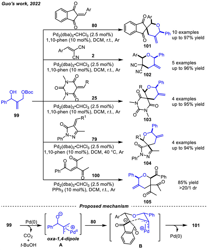 In 2022,Guo and coworkers [116] achieved the construction of tetrahydropyran derivatives 101-105 in moderate to high yields with excellent dr values ( > 20:1 dr) via palladium-catalyzed [4 + 2] cycloaddition reactions of hydroxy-tethered allyl carbonate 99 with five electron-deficient alkenes,including indandione-based alkene 80,1,1-dicyanoalkenes 2,barbiturate-derived alkenes 25,pyrazolone-derived alkenes 79,and acyl-substituted alkene 100 (Scheme 38). Interestingly,compared with the previous 3-hydroxy-2-methylenepropyl carbonates,the α-position of oxygen atom in the dipole precursors has one extra substituent in 99,and therefore the α-position of the oxygen atom in the corresponding tetrahydropyran products also has an additional chiral center. The possible mechanism is described using 99 and indandione-based alkenes 80 as substrates. First,the oxa-1,4-dipole intermediate A is produced by palladium-catalyzed decarboxylation/deprotonation of substrate 99 to release of CO2 and t-BuOH. The intermediate A subsequently attacks indandione-based alkenes 80 to give the intermediate B. The two aryl groups in the six-membered ring transition state of B are located at equatorial positions,so that the cis-isomer serves as the major product when undergoing intramolecular cyclization.