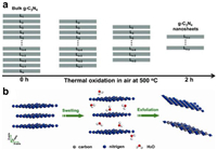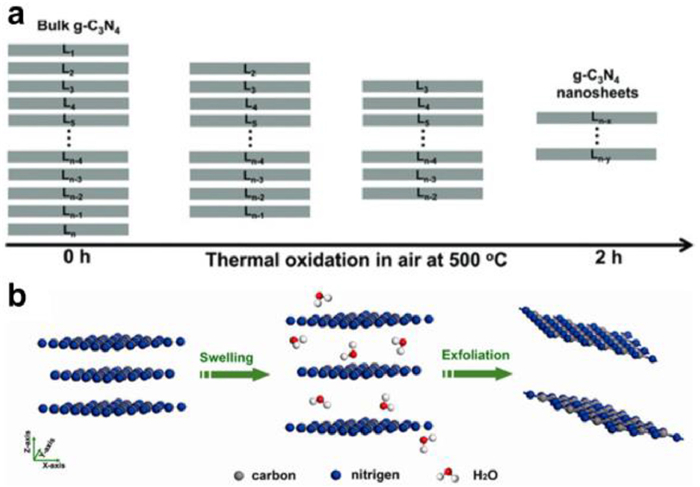| Fig. 1. (a) Schematic of the formation process of the g-C3N4 nanosheets by thermal oxidation etching of bulk g-C3N4 at 500 ℃ in air. Reproduced with permission [41]. Copyright 2012, Wiley. (b) Schematic illustration of the liquid-exfoliation process from bulk g-C3N4 to ultra-thin nanosheets. Reproduced with permission [100]. Copyright 2012, American Chemical Society. | |