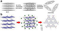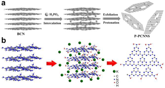 | Fig. 2. Schematic illustrations of chemical exfoliation strategy for preparing g-C3N4 nanosheets by (a) H3PO4 (Reproduced with permission [115]. Copyright 2016, Wiley) and (b) KOH (Reproduced with permission [116]. Copyright 2017, Elsevier). | |