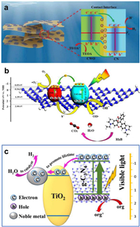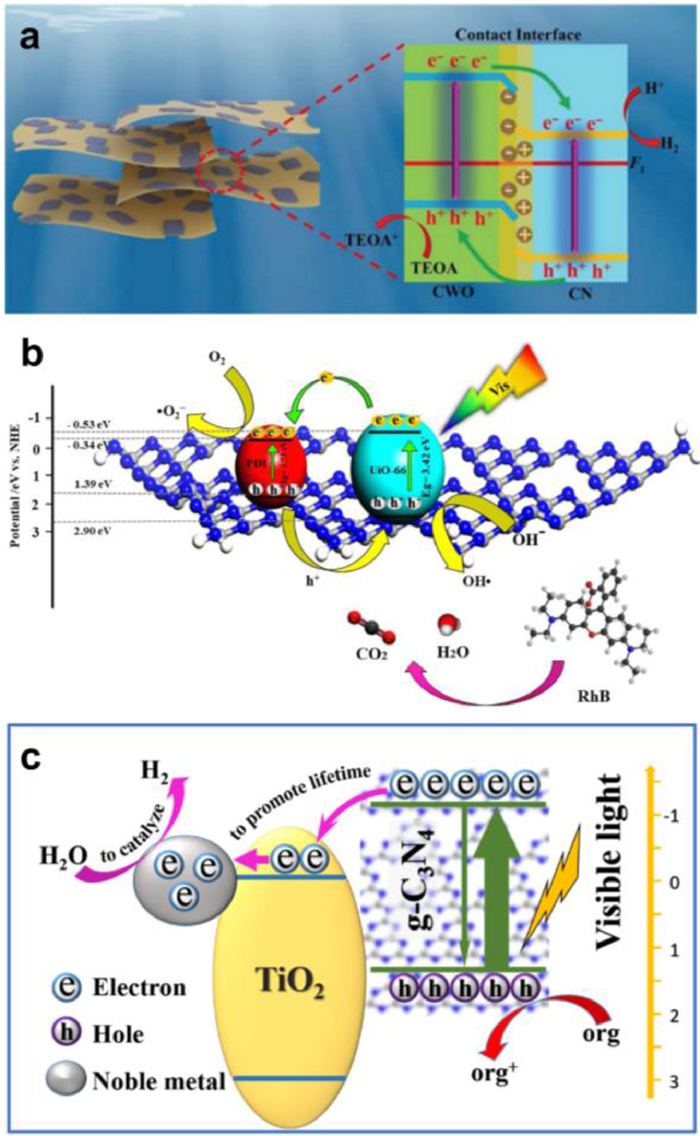 | Fig. 3. (a) Schematic illustration for photocatalytic mechanism of CoWO4/g-C3N4 photocatalysts. Reproduced with permission [128]. Copyright 2017, Springer. (b) The suggested photocatalytic RhB degradation mechanism over 30PCN@UiO-66 system under visible-light illumination. Reproduced with permission [134]. Copyright 2021, Elsevier. (c) Mechanism of the photo-generated charge transfer and induced photo-catalytic processes for H2 evolution in the presence of methanol under visible-light irradiation on g-C3N4/metal hetero-structure. Reproduced with permission [144]. Copyright 2018, Elsevier. | |
