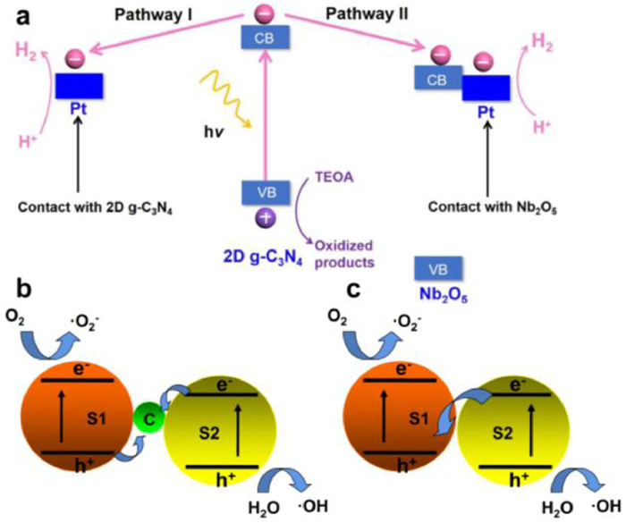 | Fig. 5. (a) Schematic of electron transfer in Nb2O5/g-C3N4 nanosheets hybrid photo-catalyst. Reproduced with permission [178]. Copyright 2021, Elsevier. The charge transfer mechanism of SCS (b) and SS (c) Z-scheme. | |