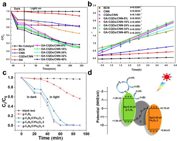 | Fig. 7. (a) Absorptive, photo-catalytic removal of aqueous MO over graphene-carbon quantum dots/g-C3N4 nanosheets composite under visible light (λ > 420 nm), and (b) corresponding kinetic simulation curves. (a, b) Reproduced with permission [149]. Copyright 2018, Elsevier. (c) Cr(VI) reduction efficiency by different photocatalysts and (d) schematic illustration of the reduction of Cr(VI) by g-C3N4/C/Fe2O3 under light irradiation. (c, d) Reproduced with permission [205]. Copyright 2021, American Chemical Society. | |