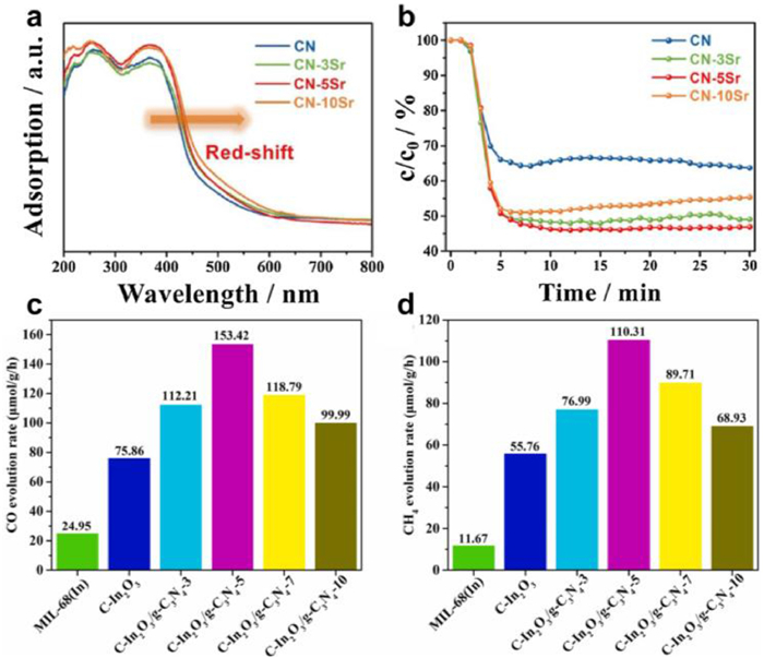| Fig. 8. The UV–vis spectra (a) and photocatalytic activity for NO removal (b) of as-prepared samples. (a, b) Reproduced with permission [166]. Copyright 2018, Elsevier. (c) Production rate of CO and (d) Production rate of CH4 for C-In2O3/g-C3N4 composite under ultraviolet light. (c, d) Reproduced with permission [206]. Copyright 2021, Elsevier. | |