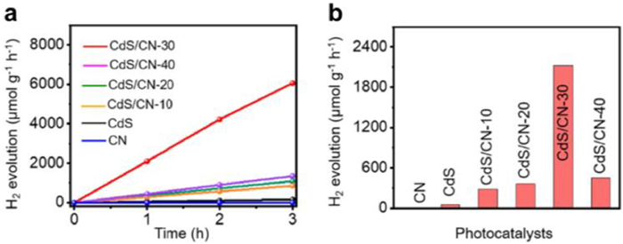 | Fig. 9. Photocatalytic activity in H2 production. (a) The time-dependent H2 production curves of different photocatalysts. (b) H2 generation rate of different photocatalysts; All the photocatalytic H2 generation tests were measured under visible-light irradiation (λ > 400 nm) and in 80 mL aqueous solution containing 10 vol% sacrificial reagents without cocatalysts. Reproduced with permission [131]. Copyright 2022, Elsevier. | |