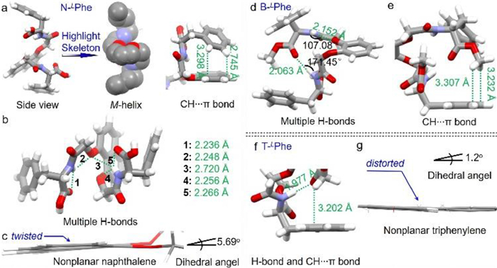To further understand the effect of folding behavior on the chiral geometry, single crystals were cultivated. N-LPhe and N-LOA successfully crystallized in the acetone/decane mixtures via liquid phase diffusion. In the crystal structure, the molecular skeleton of N-LPhe folded into an M-helix structure (Fig. 2a). This helical structure was reminiscent of α-helical structure directed by two chiral molecular arms. M-handed helix originated from the absolute chirality of amino acid, which twisted naphthalene plane to compensate the formation of the helical turn and the helical structure was stabilized by several noncovalent interactions, including multiple H-bonds and CH⋯π. Distances of CH⋯π bonds between benzene and naphthalene were determined as 2.745 and 3.298 Å, respectively (Fig. 2a). Multiple intramolecular hydrogen bonds further anchor the spiral conformation (Fig. 2b). The presence of amides and carboxylic acids induced the formation of multiple intramolecular hydrogen bonds. Distances were determined as 2.236, 2.248, 2.945, 2.720, 2.256 and 2.266 Å, respectively. Multiple intramolecular hydrogen bonds further stabilized the structure and properties of molecules. Due to the folding and steric hindrance effect, the naphthalene plane was deformed under the control of two chiral arms with a dihedral angle of 5.69° (Fig. 2c). The twisted naphthalene contributed to the active chiroptical properties measured in solution. The DFT optimized structure of B-LPhe and T-LPhe showed a closed geometry with intramolecular multiple H-bonded networks and CH⋯π bonds. As shown in Fig. 2d, the distance of the hydrogen bond was 2.063 Å and 2.152 Å, with ∠N—H⋯O angle of 107.05° and 171.45°, respectively. In Fig. 2e, the CH⋯π distances were determined as 3.307 Å and 3.232 Å respectively. In addition, some of the molecular fragments of T-LPhe were shown in Fig. 2f, the hydrogen bond with a distance of 1.977 Å was found. As shown in Fig. 2g, the triphenylbenzene region of T-LPhe represented slightly distorted, forming a nonplanar structure with the dihedral angle of 1.2° [25–27].