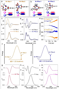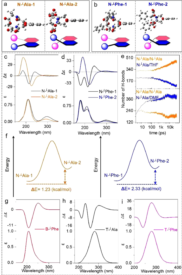 | Fig. 4. (a, b) Optimized structures with different arm-orientation of N-LAla and N-LPhe. (c, d) Calculated ECD spectra between two different conformations. (e) The number of hydrogen bonds in THF and DMF, respectively. (f) Calculated energy barriers of N-LAla and N-LPhe. (g-i) Calculated ECD spectra of B-LPhe, T-LAla and T-LPhe at the B3LYP/6–311G(d) level. | |
