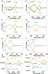 | Fig. 1. Chiroptical activities. (a, b) CD spectra of N-Ala (1 mmol/L in DMF and THF, respectively). (c) CD spectra of N-Phe-in THF (1 mmol/L). (d) CD spectra of B-Phe-in THF (4 mmol/L). (e, f) CD spectra of T-Ala-in THF and T-Phe-in DIOX (0.08 mmol/L), respectively. (g, h) CPL spectra of N-Ala-immobilized in polymethylmethacrylate (PMMA) matrices. Solvents were DMF and THF, respectively (λex = 300 nm). | |