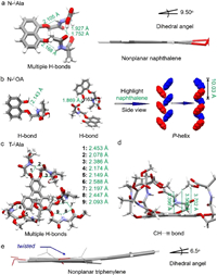 | Fig. 3. (a) DFT optimized N-LAla at the B3LYP/6–311G(d) level of theory. (b) X-ray structure of N-LOA. Naphthalene moieties were highlighted in CPK mode to show the supramolecular helical structure. (c-e) DFT optimized geometry of T-LAla at the B3LYP/6–311G(d) level of theory. | |