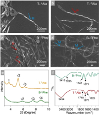 | Fig. 5. SEM images of self-assembly systems: (a) T-LAla, (b) T-DAla, (c) B-LPhe, (d) B-DPhe (concentrations of each component were fixed at 1 mmol/L). (e) XRD spectra of T-LAla and B-LPhe assemblies. (f) FT-IR spectra of T-LAla and B-LPhe assemblies. | |