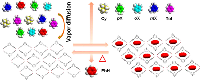 Gasoline [1], as a complex mixture of volatile and flammable hydrocarbons, contains about 21% BTX (benzene, toluene (Tol), and xylene (oX, mX, pX)). Because of the incomplete combustion of gasoline, the exhaust gases of vehicles containing a large amount of BTX are released to the air, causing environmental pollution [2]. As a member of BTX gases, benzene (PhH) is harmful to human health, and can cause various diseased [3,4]. With the increasing consumption of gasoline by a large number of vehicles, benzene-induced environmental pollution facing the world is becoming increasingly serious. Thus, it is very urgent to develop new technologies with environmental-friendly, recyclable, low cost and high selectivity to reduce the amount of benzene in exhaust gases of cars. Recently, using activated carbon as adsorbent to adsorption of benzene from automotive gasoline has become a hot topic in the field of material science [5-9]. Employing MOFs for the separation of industrially important hydrocarbon mixtures has also been experimentally investigated [10-19].